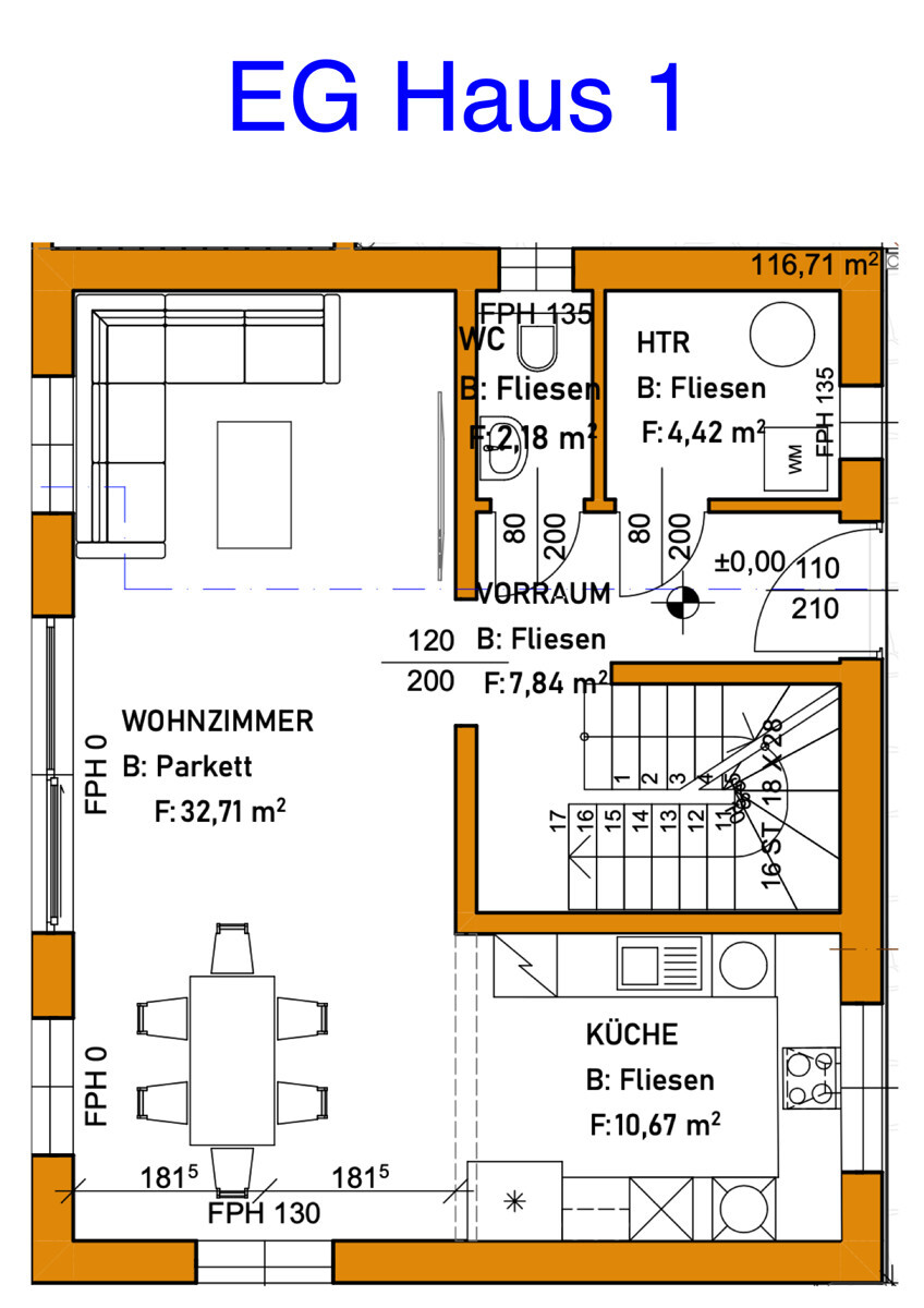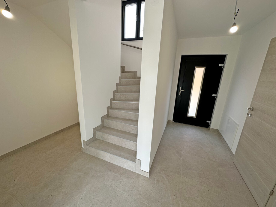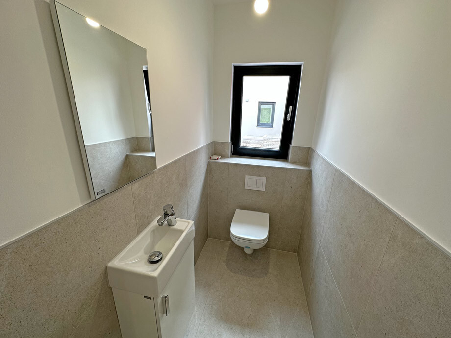 Über den Vorraum ist der Technikraum mit Waschmaschinenanschluss, Fenster und genügend Platz für einen Trockner sowie das extra WC mit Fenster und Handwaschbecken zu begehen. Praktisch ist der zusätzliche Stauraum unter der Treppe für Garderobe oder zur Verwendung als zusätzlichen Abstellraum.