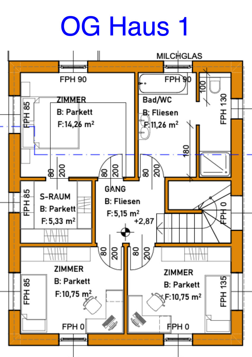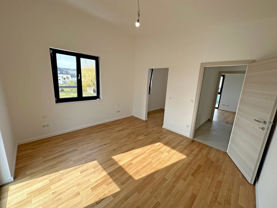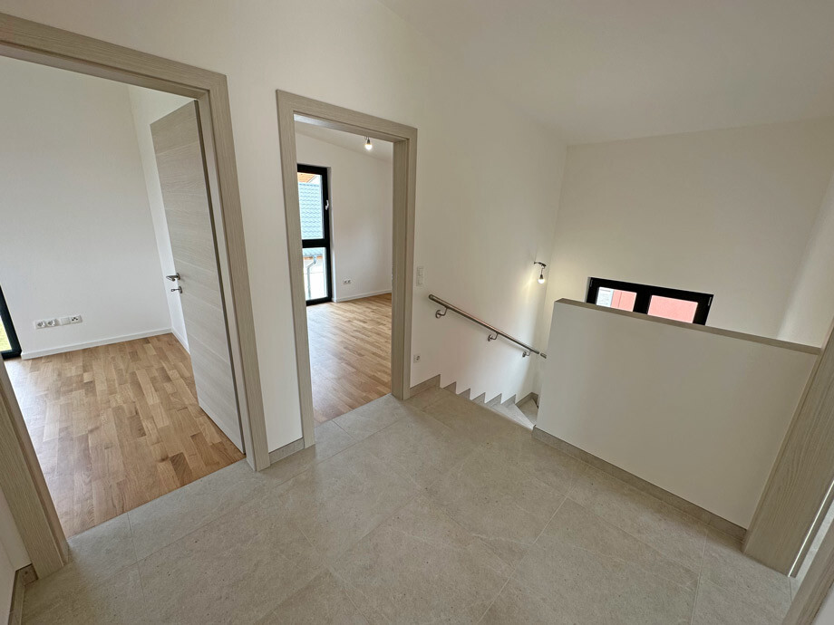 Dank dem Pultdach verläuft die Raumhöhe im Obergeschoß von 2,30 m bis zu 3,20 m und verleiht der oberen Etage eine luftige Atmosphäre. Die Schlafzimmer zeigen sich dank dem hochwertigen Eichenparkettboden in ansprechender Natürlichkeit. Ein begehbarer Schrankraum in einem der drei Schlafzimmer ergänzt den Wohnkomfort.
