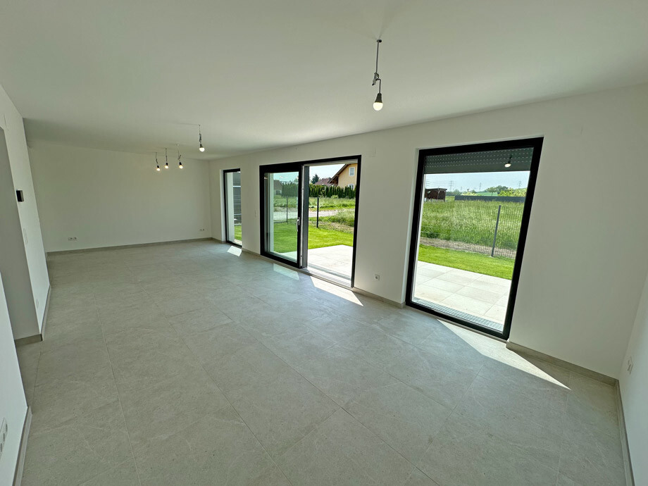 Große bodenebene Fenster, die das Sonnenlicht in die Wohnräume lassen und den Blick in die Natur ermöglichen, schaffen Wohlfühlcharakter. Der große und lichtdurchflutete Wohnraum – kombiniert mit Essbereich (Top 2 = hochwertige österreichische EWE-Küche inkl. Einbaugeräten inkludiert) – ist sicherlich der Lebensmittelpunkt des Hauses mit seiner Größe von 42,32 m². Das Fenster beim Essplatz gewährt einen wunderbaren Blick auf die anschließenden Felder. Die dreifach verglasten Fensterfronten und die leichtgängige Schiebetür auf die 18 m² große Terrasse und in den Garten unterstreichen die moderne Bauausführung.